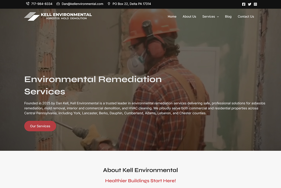 To support Kell Environmental’s online presence, MFG Builders developed a strategy centered on construction website design and content structuring that aligns with how clients search for environmental remediation and hazard mitigation services. We reorganized the site around clearly defined service pages for asbestos abatement, mold remediation, interior demolition, and HVAC cleaning, each with focused content that reflects real search queries used by property owners and facility managers in Central Pennsylvania.
